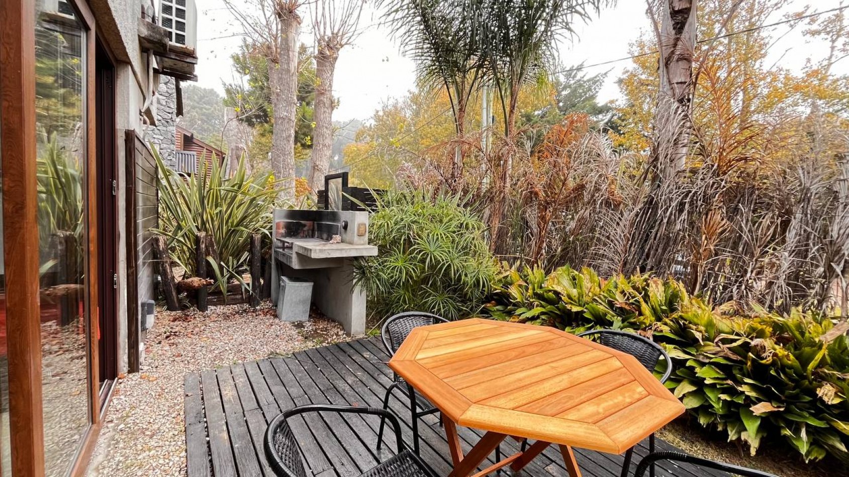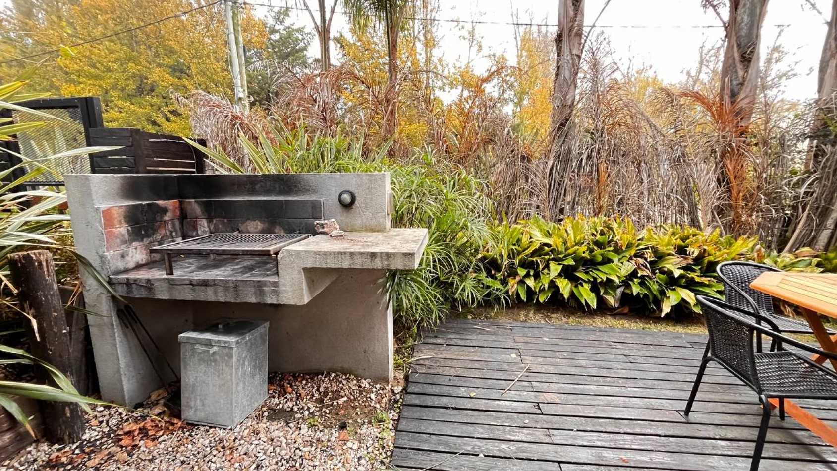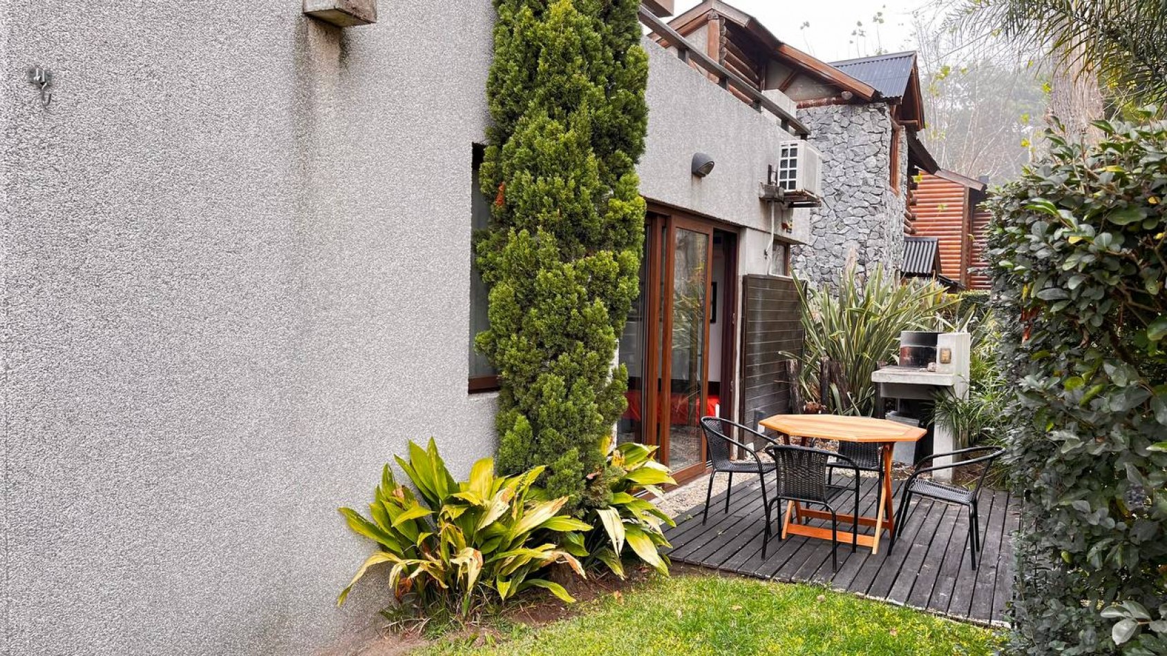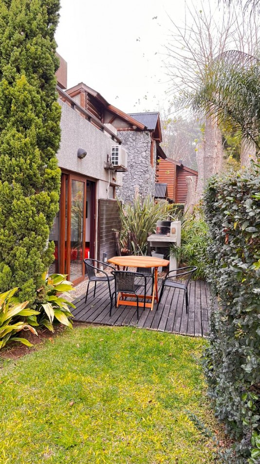 Cuenta con un deck con parrilla, mesas y sillas de exterior para disfrutar del entorno del jardín con álamos y pinos. Aire acondicionado frio calor en living
