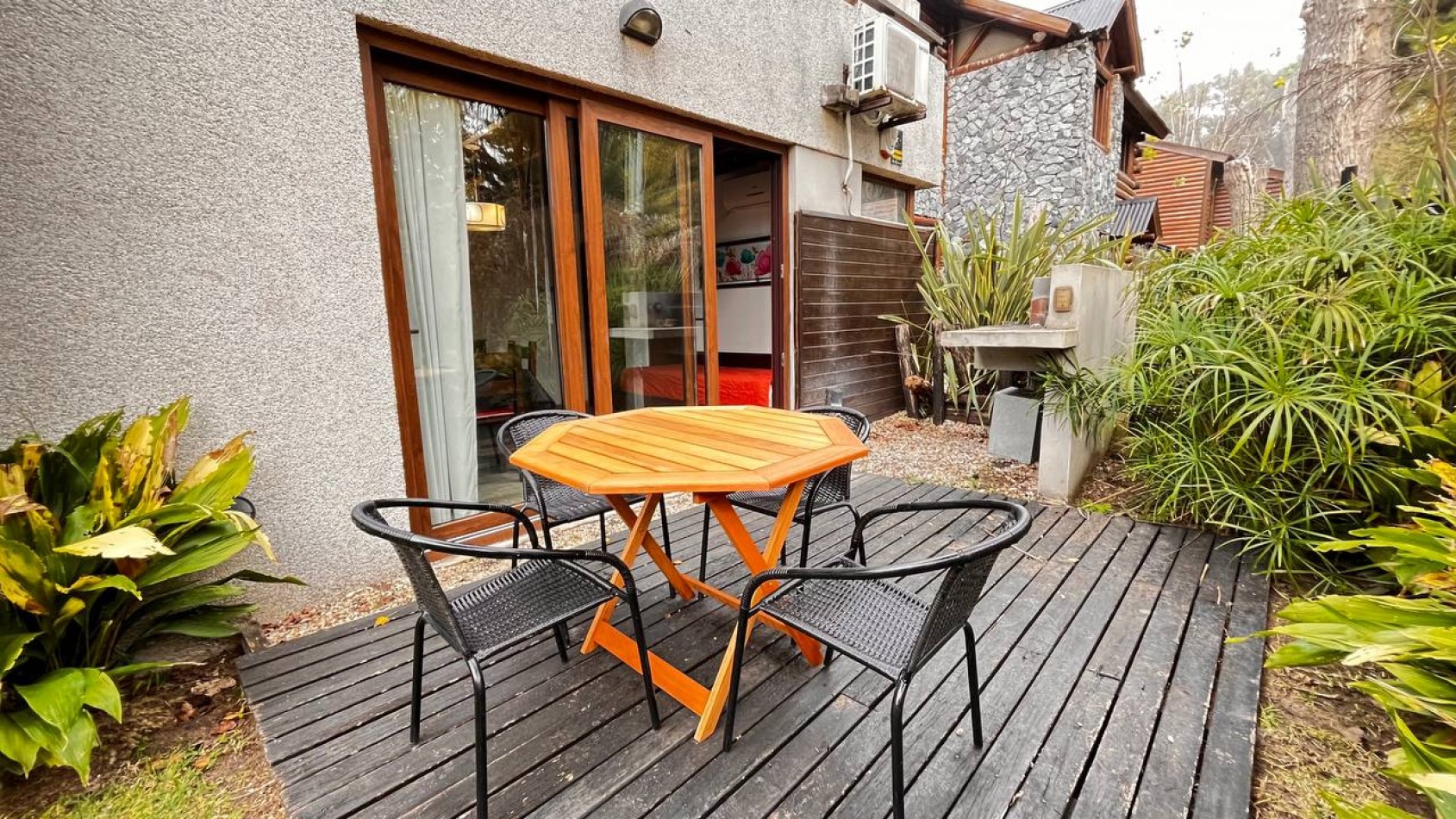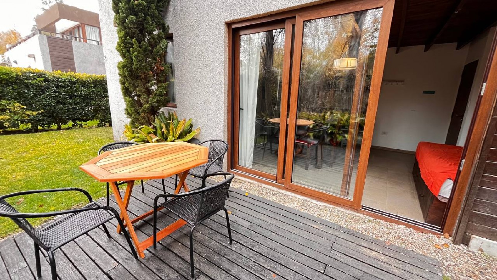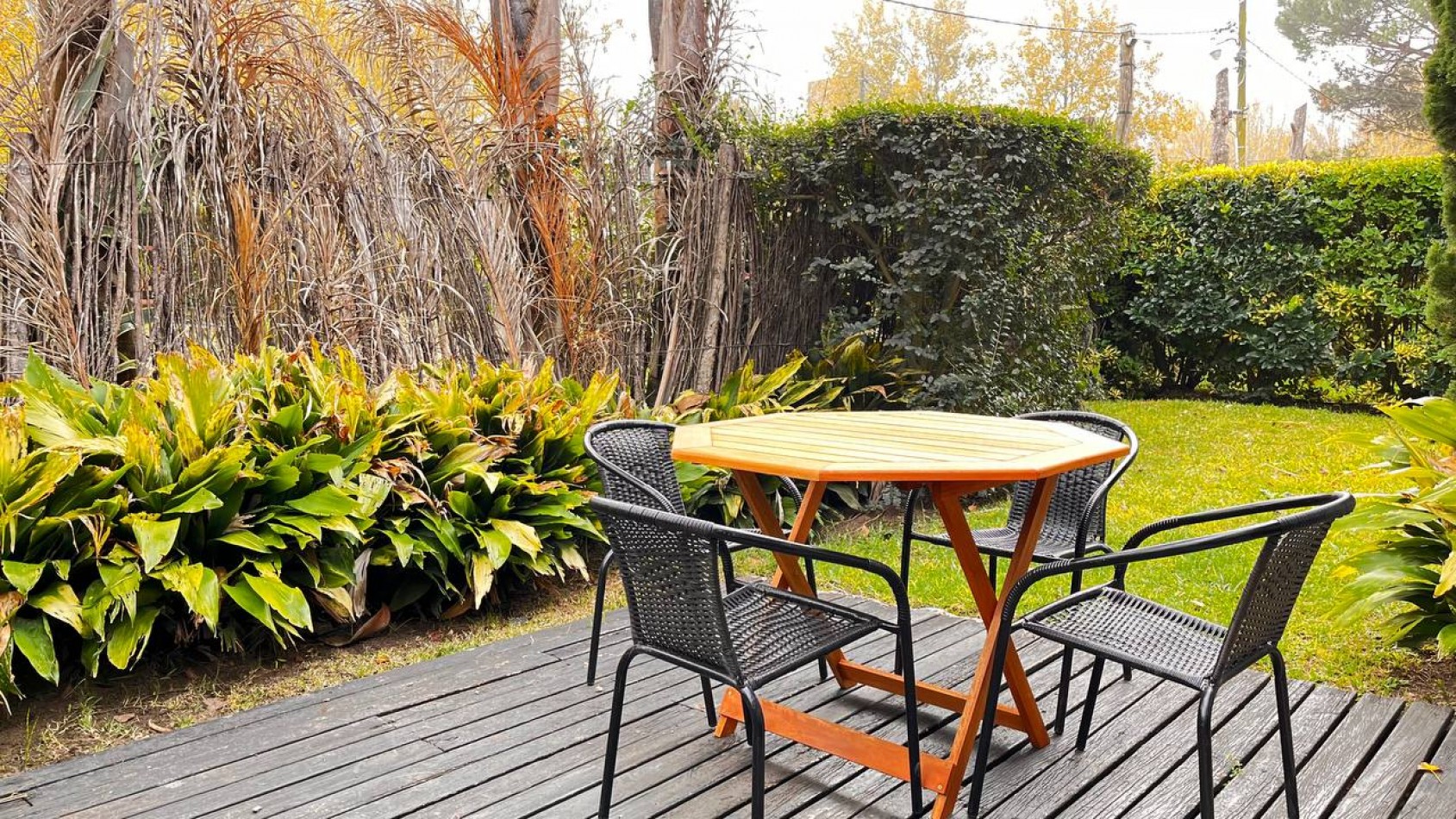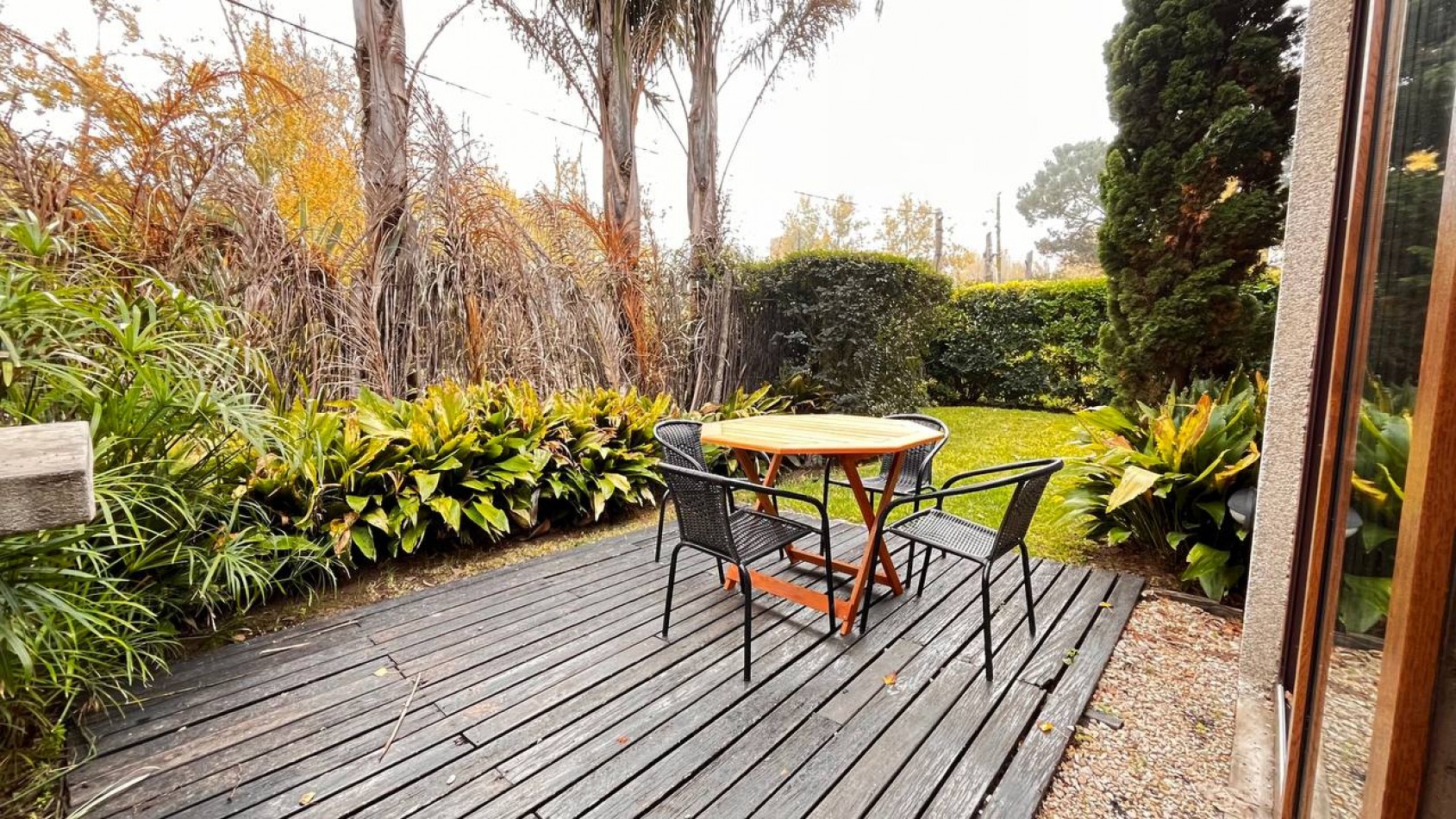 Cuenta con un deck con parrilla, mesas y sillas de exterior para disfrutar del entorno del jardín con álamos y pinos. Aire acondicionado frio calor en living